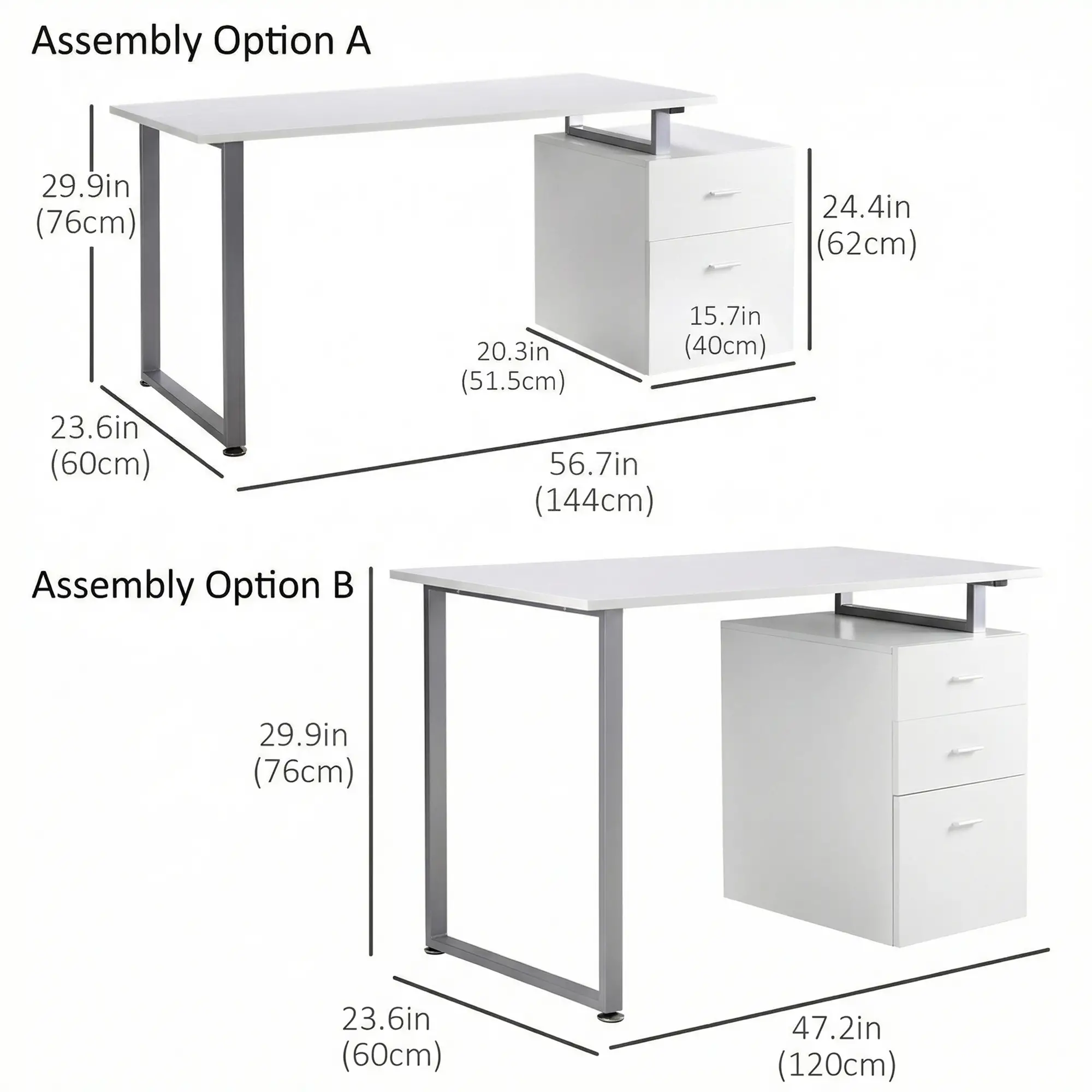 47" L Computer Desk, Metal Frame, Reversible File Drawers, White