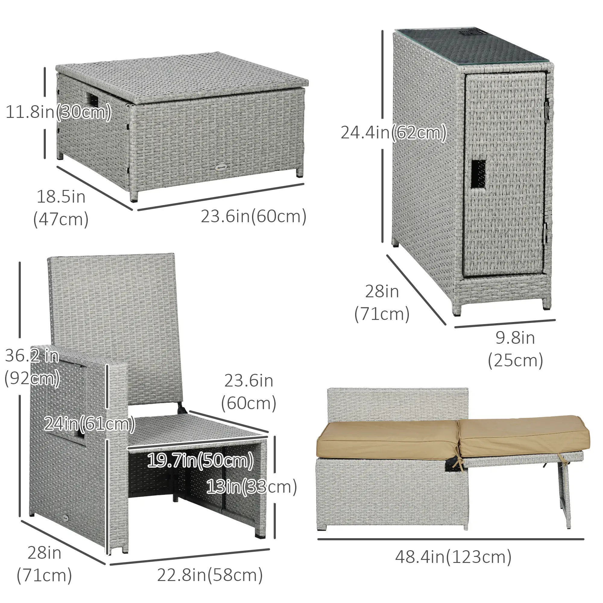 - Footstool: 18.5" W x 23.6" D x 11.8" H (47 x 60 x 30 cm)